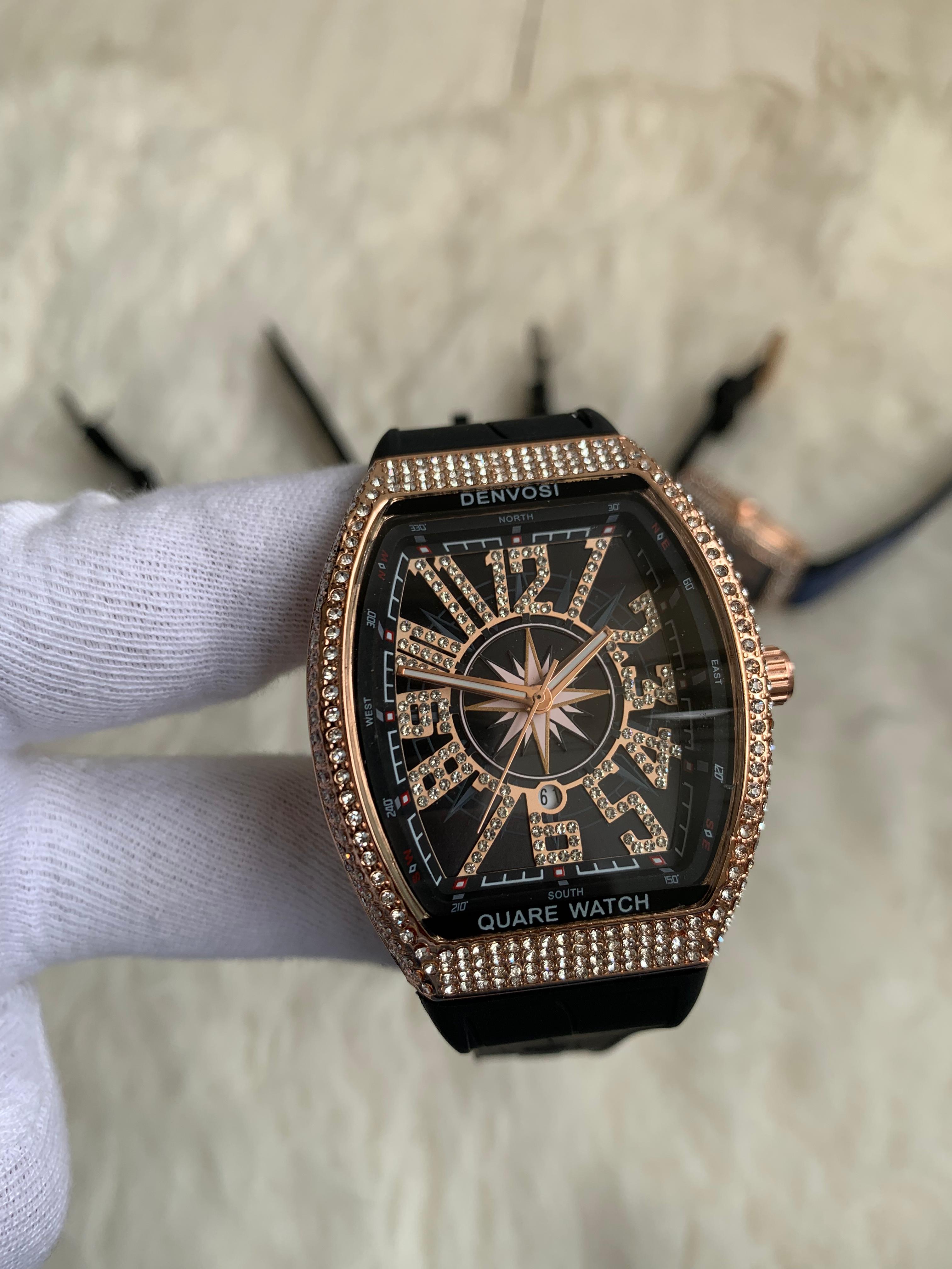 A bold fusion of elegance and innovation, the DENVOSI Quare Watch features a distinctive tonneau-shaped case adorned with brilliant stones that accentuate its luxurious aesthetic. The dial showcases an intricate compass-inspired centerpiece, complemented by oversized, crystal-set numerals for a striking display. Designed for those who appreciate detail and sophistication, this timepiece blends modern design with timeless appeal, making it a perfect statement accessory for any occasion.