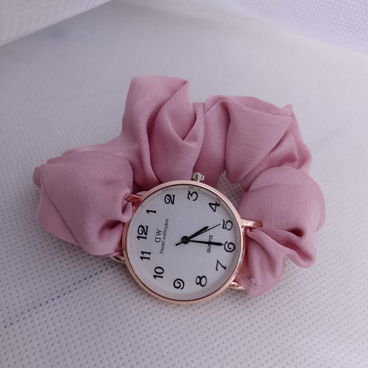 This is a fashion wristwatch designed with a minimalistic and elegant aesthetic. It features a classic round dial with Arabic numeral hour markers, making it highly legible. The quartz movement ensures precise timekeeping with minimal maintenance. The standout feature of this watch is its unique scrunchie-style strap, offering both comfort and a stylish, casual look.