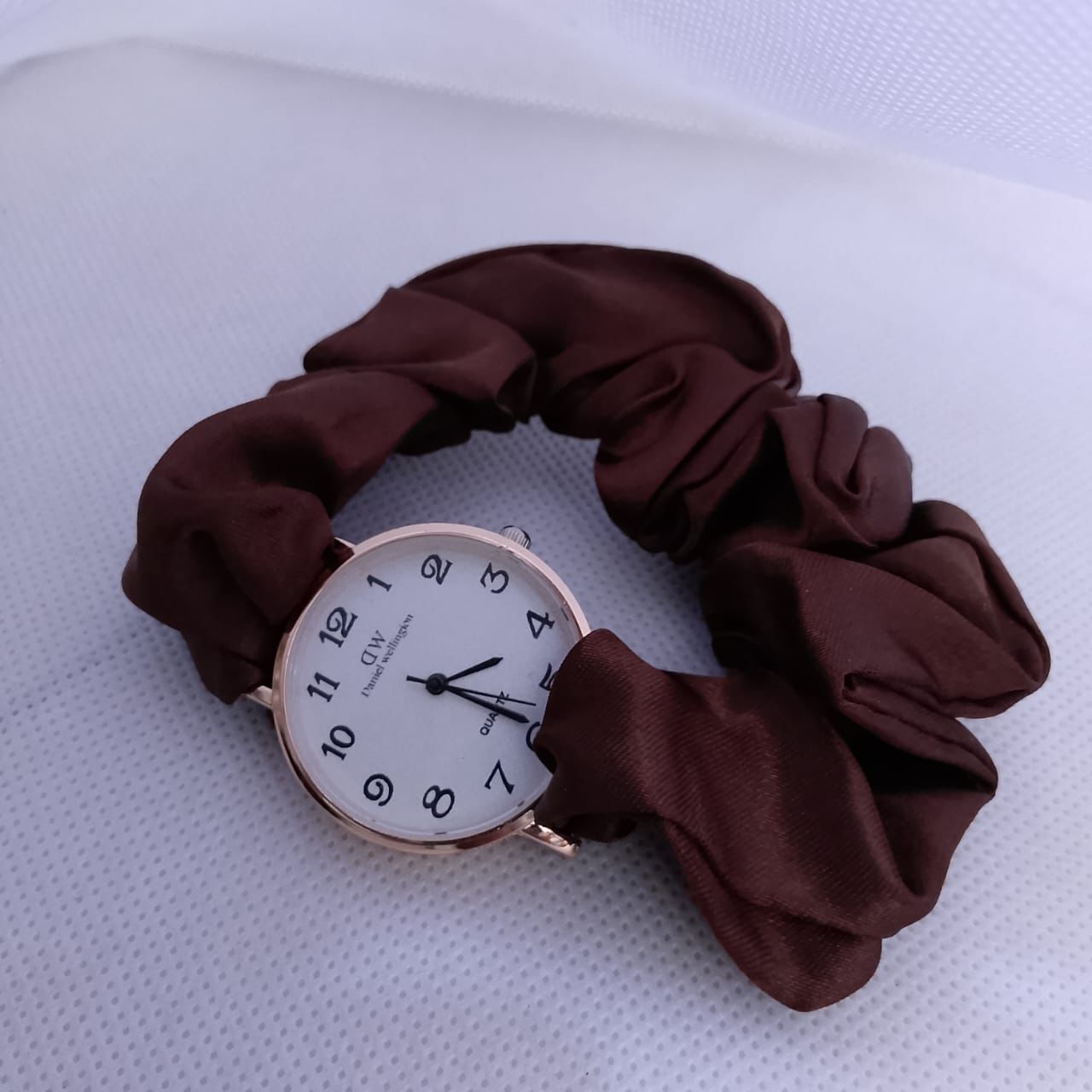 This is a fashion wristwatch designed with a minimalistic and elegant aesthetic. It features a classic round dial with Arabic numeral hour markers, making it highly legible. The quartz movement ensures precise timekeeping with minimal maintenance. The standout feature of this watch is its unique scrunchie-style strap, offering both comfort and a stylish, casual look.