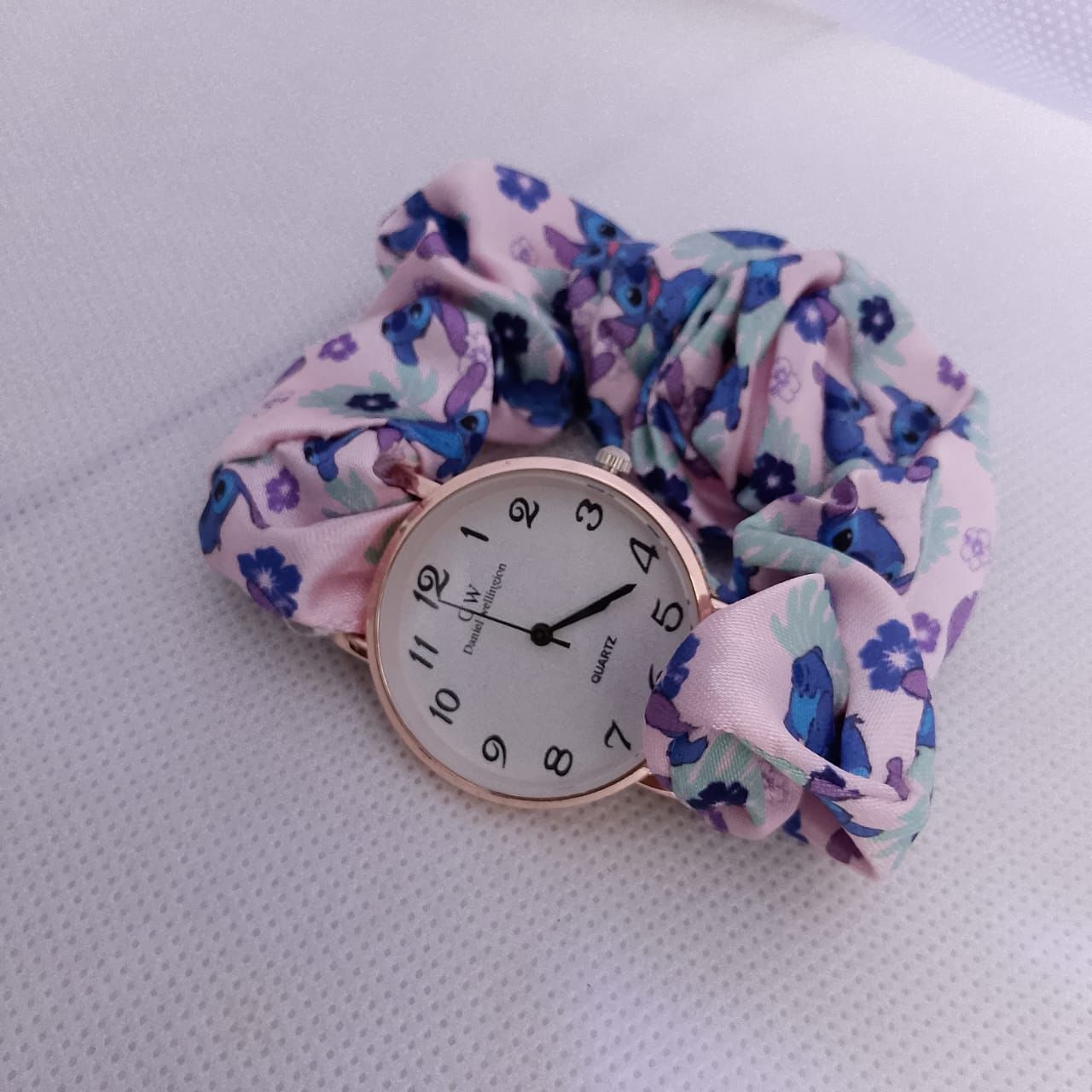 This is a fashion wristwatch designed with a minimalistic and elegant aesthetic. It features a classic round dial with Arabic numeral hour markers, making it highly legible. The quartz movement ensures precise timekeeping with minimal maintenance. The standout feature of this watch is its unique scrunchie-style strap, offering both comfort and a stylish, casual look.