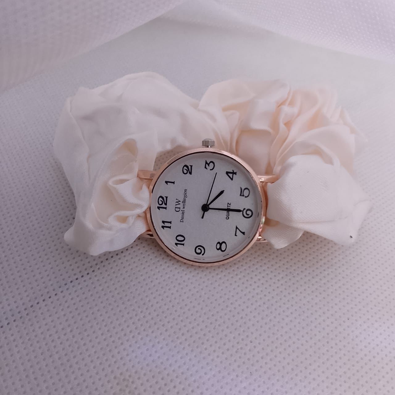 This is a fashion wristwatch designed with a minimalistic and elegant aesthetic. It features a classic round dial with Arabic numeral hour markers, making it highly legible. The quartz movement ensures precise timekeeping with minimal maintenance. The standout feature of this watch is its unique scrunchie-style strap, offering both comfort and a stylish, casual look.