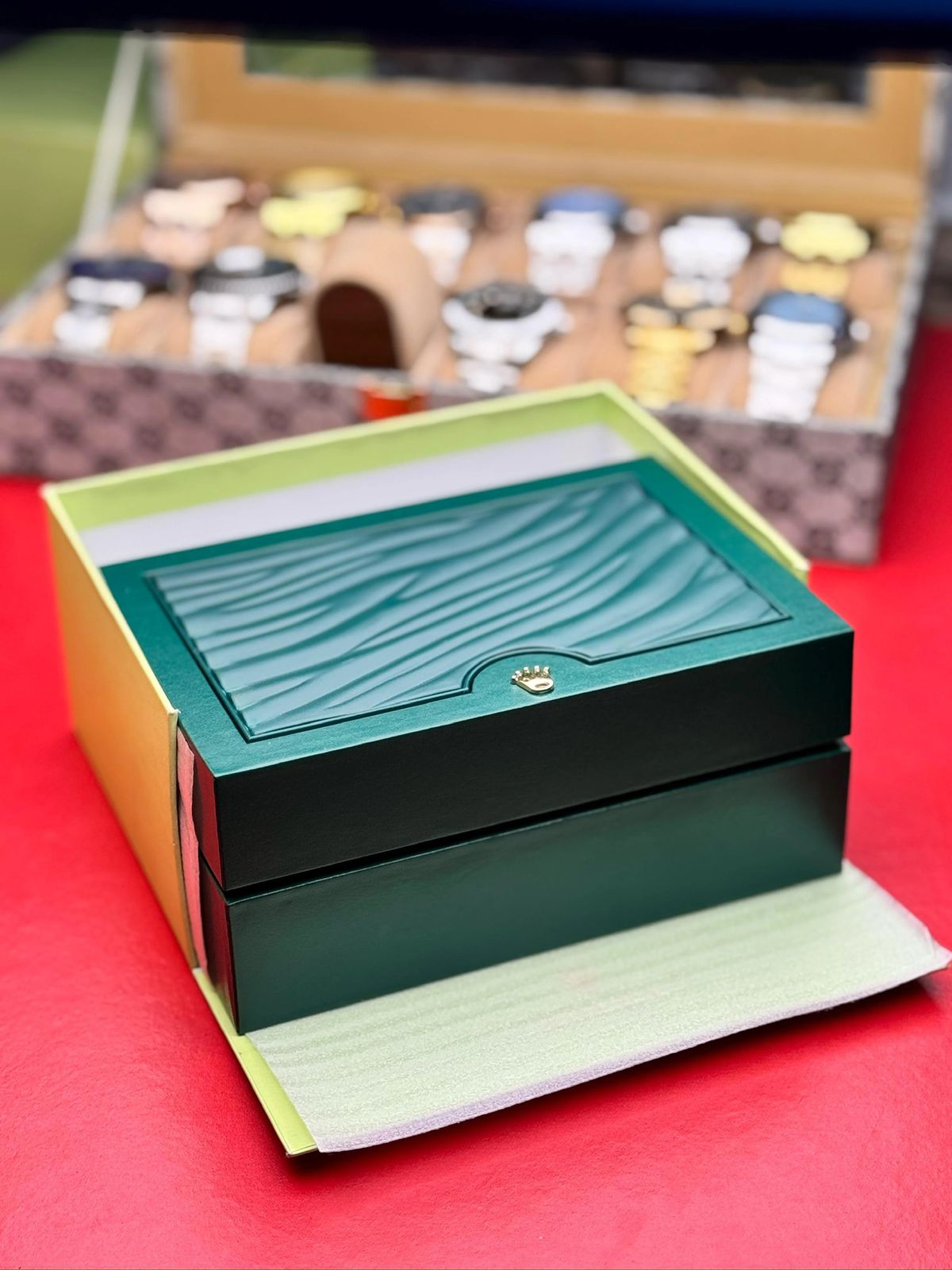 An elegant Rolex presentation box, crafted for storing and showcasing fine timepieces. It features a wave-patterned lid with the brand’s emblem, a sturdy protective shell, and a cushioned interior for safely holding your watch. Ideal for collectors or as a premium storage case.