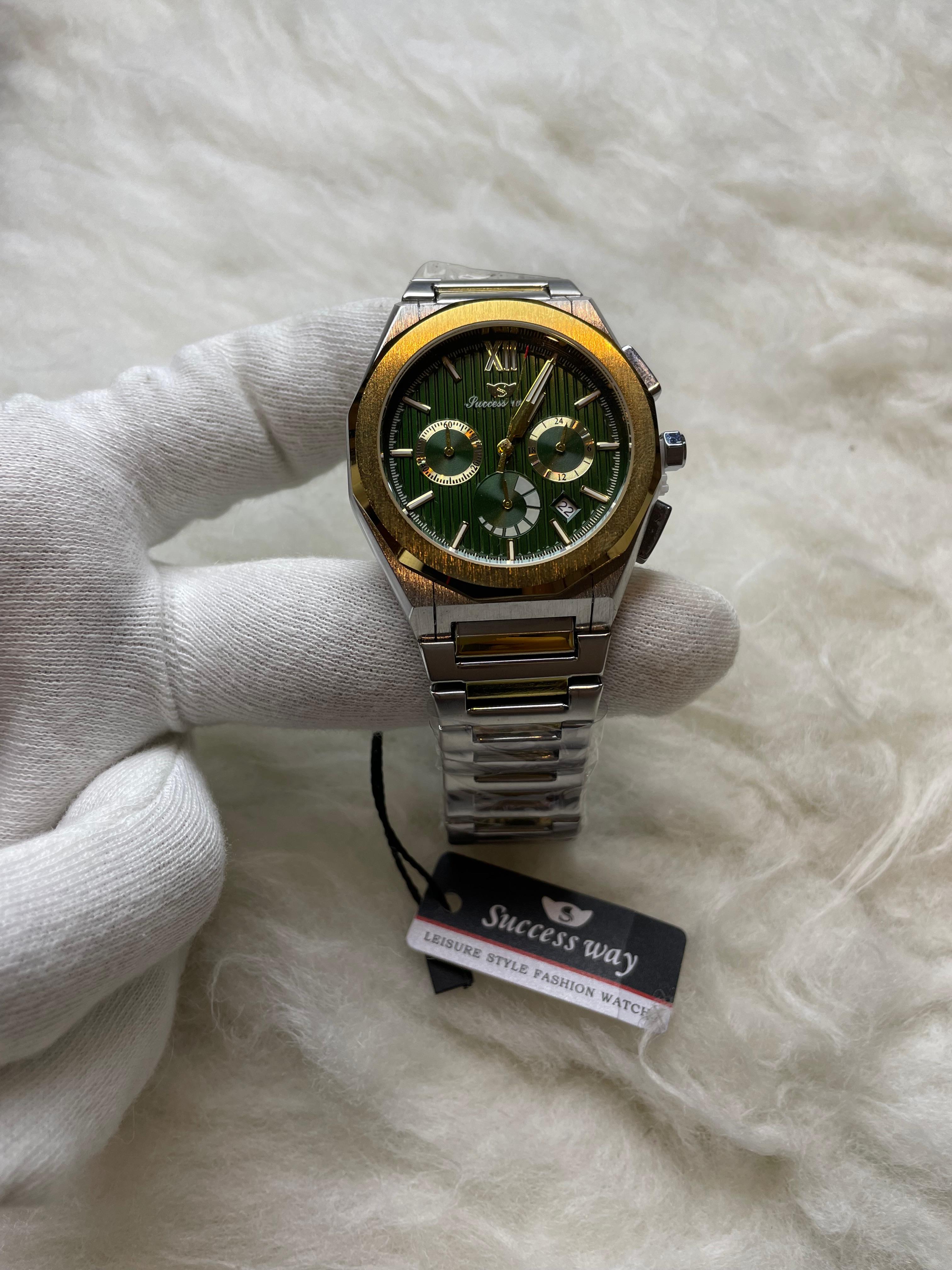 This is a fashionable men’s wristwatch from the brand Success Way, designed to complement casual and modern styles. It features a textured dial with Roman numeral and stick hour markers, three sub-dials arranged in a chronograph-inspired layout, and a date display located near the 4 o’clock position. The octagonal bezel gives the watch a bold and distinctive appearance, while the linked bracelet adds a polished, contemporary finish. With its combination of sporty elements and stylish design, this timepiece is ideal for everyday wear or as an accessory for leisure occasions.