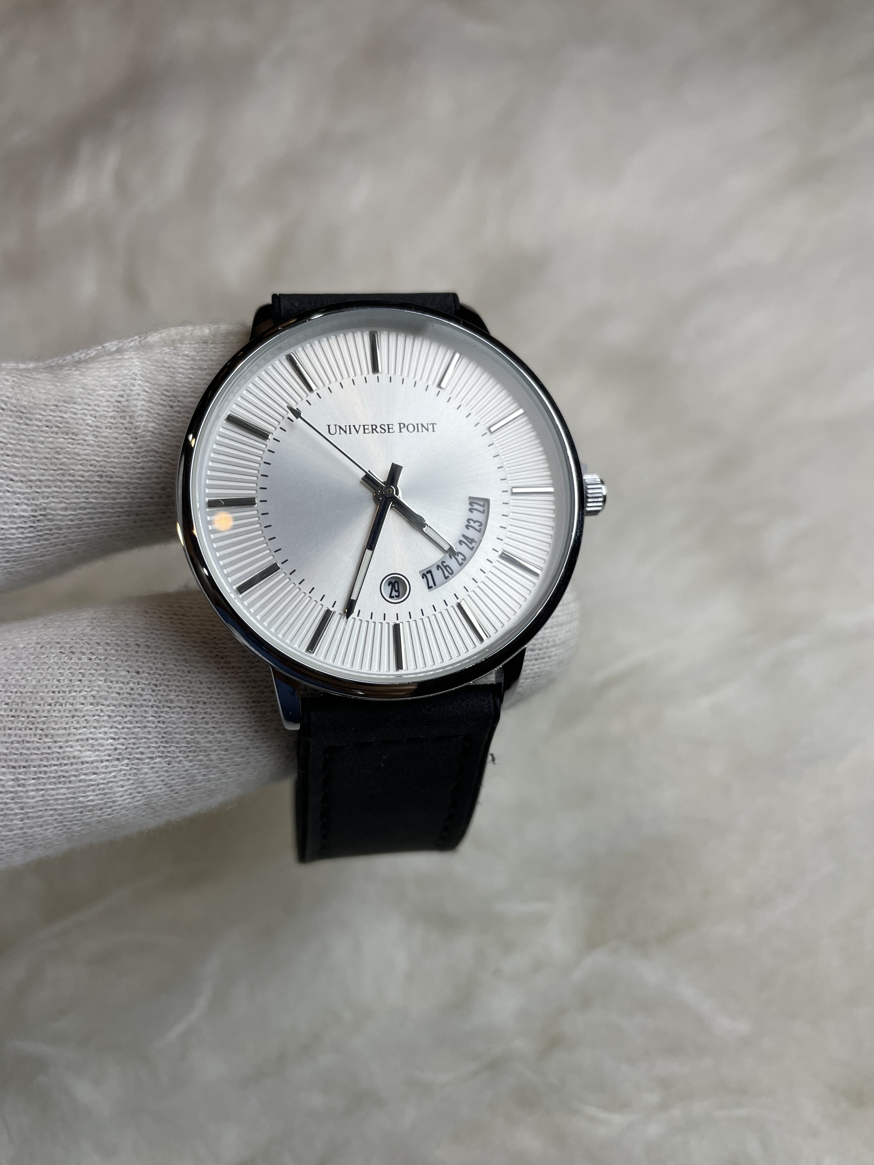 Minimalism meets functionality in this refined timepiece by Universe Point. Featuring a sleek, radial-textured dial with slim hour markers and clean indices, this watch balances modern design with timeless elegance. A curved date display adds a distinctive touch, complemented by a discreet circular marker near the 6 o’clock position. Paired with a smooth strap and polished case, it’s an ideal accessory for both everyday wear and formal occasions.